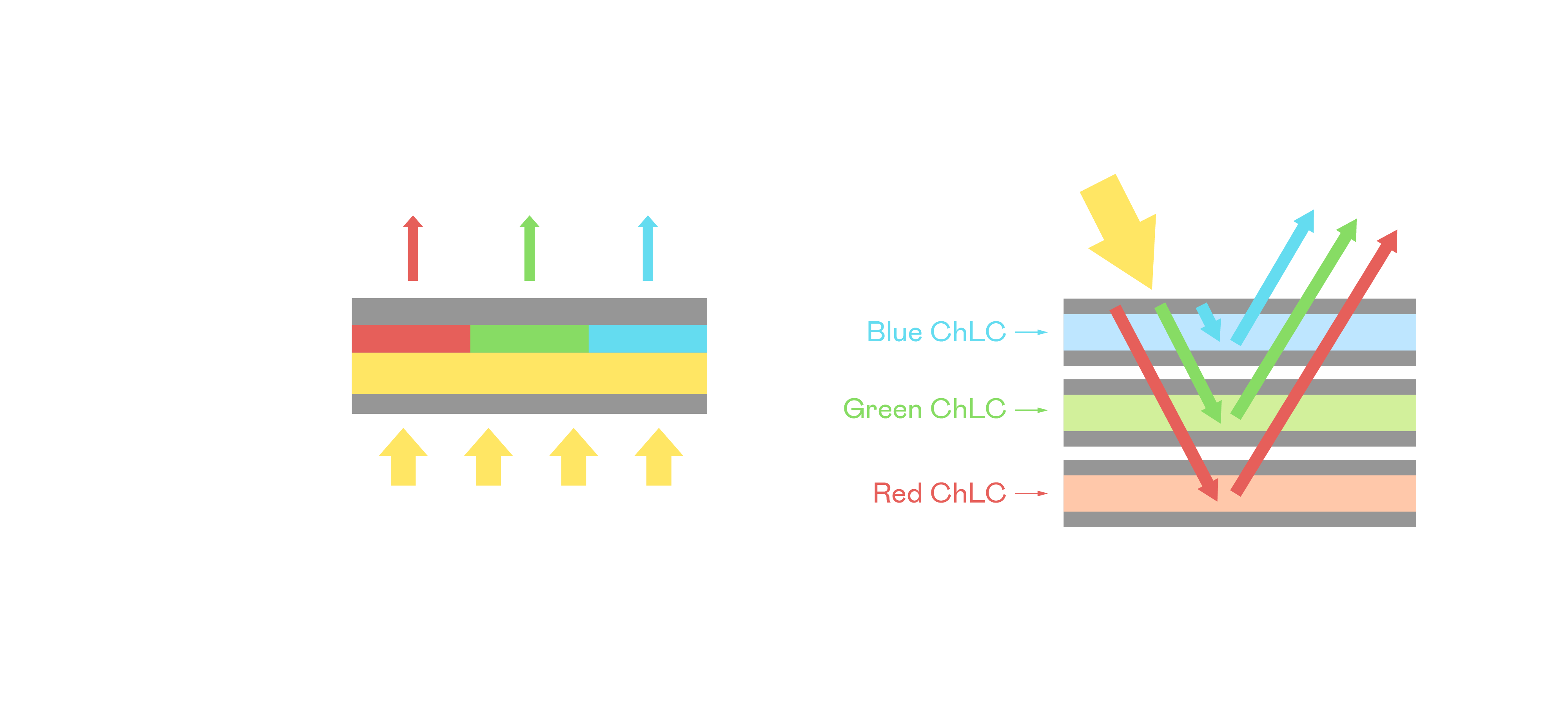 环球360胆固醇液晶显示器是由红、绿、蓝三层胆固醇液晶面板堆叠而成,并采用无彩色滤光片设计,减少环境光在反射过程中的损耗。